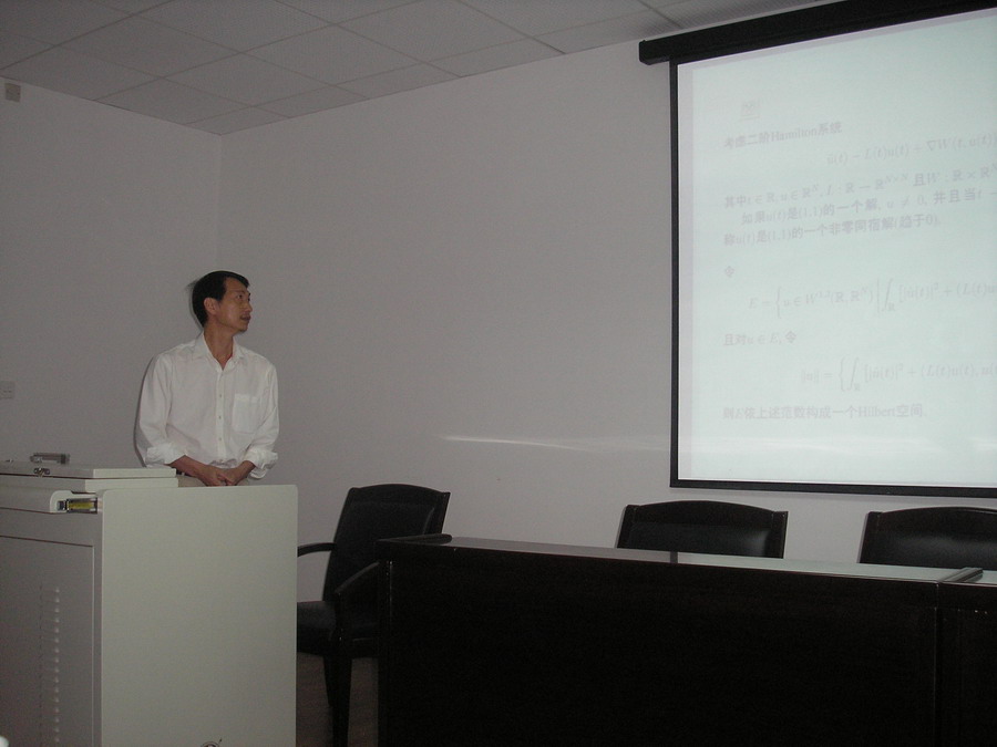 在报告中欧春华教授通过趋向性模型及趋向性填充模型的历史背景、最小波速及波速的确定、行波解存在性的严格证明、数值模拟、讨论五部分详细讲解了研究趋向性填充模型行波解存在性的方法和意义;唐先华教授也通过二阶Hamiltonian系统的变分结构与临界点、具周期性系数的二阶Hamiltonian系统的同宿轨、具非周期性系数的二阶Hamiltonian系统的同宿轨(I)、具非周期性系数的二阶Hamiltonian系统的同宿轨(II)四部分详细讲解了研究二阶Hamiltonian系统的同宿轨的方法和主要结论。报告最后,热情的欧教授和唐教授还对老师和学生提出的问题给出了详细解答。