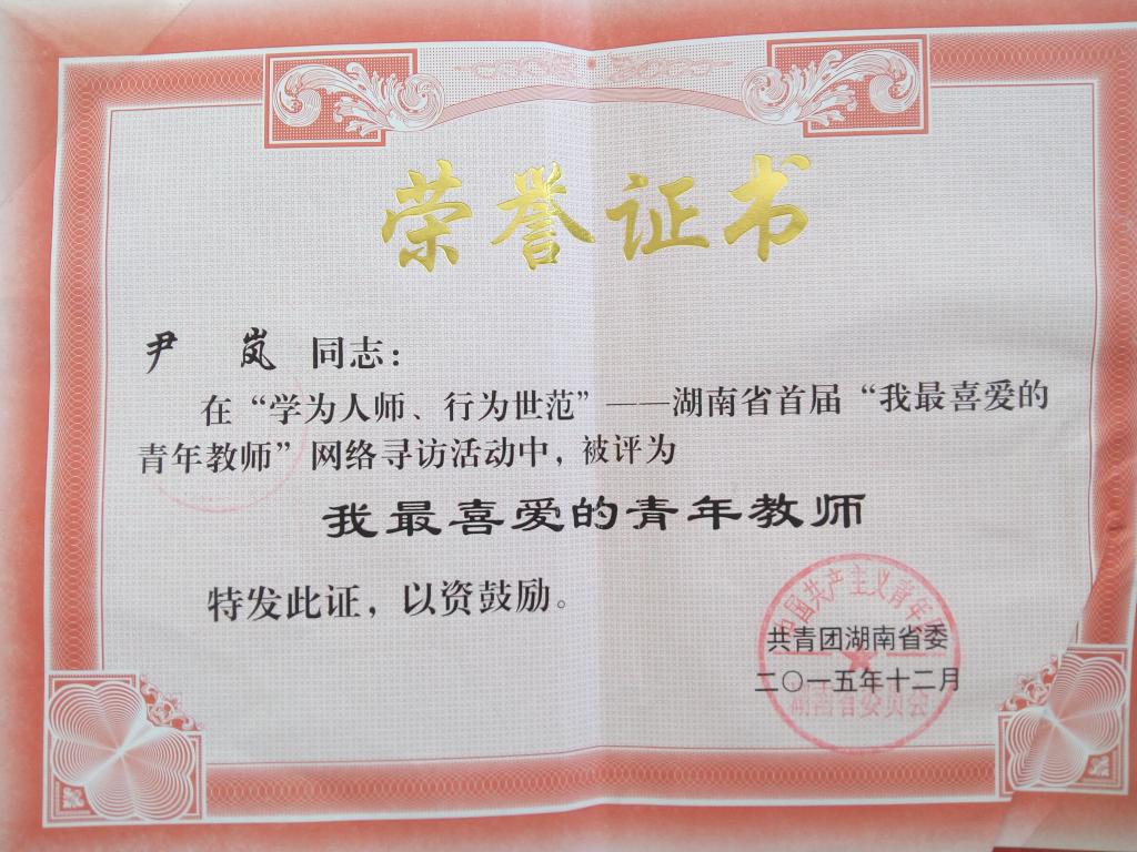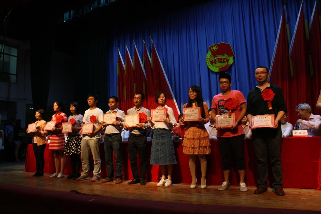 2016年5月3日晚7点30分,在南校大礼堂召开的纪念五四运动97周年暨2015-2016年度五四表彰大会上,我院尹岚老师(左三)在“学为人师、行为世范”—湖南省首届“我最喜爱的青年教师”网络寻访活动中被评为“我最喜爱的青年教师”。
