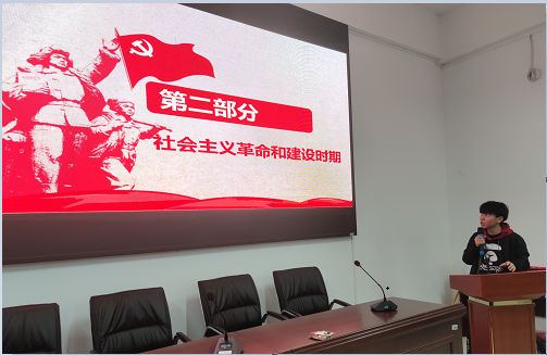 第二部分社会主义革命和建设时期以及第三部分改革开放和社会主义现代化建设新时期由学生支委会助理曹嘉镟讲述。在第二部分中,曹嘉镟对社会主义制度的建立、第一届全国人民代表大会(宪法)、社会主义建设在探索中曲折发展这三方面进行重点讲述。在第三部分中,他对社会主义现代化建设局面的形成、全面改革和对外开放的发展进行重点讲述。从他的话语中,我们了解到了中国共产党的几次全国人民代表大会以及中国共产党的五代领导核心。