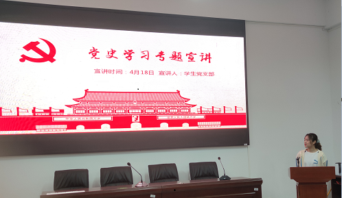 宣讲第一项,由学生党支部组织委员黄泓杰和学生党支部副书记韩骐鸿围绕“学习党史的意义”进行发言。黄泓杰认为这其中有我们值得学习的抗战期间无私奉献的爱国主义精神和艰苦卓绝的奋斗精神;韩骐鸿讲述了学习党史的必要性。党史中有很多成功的经验:党的建设经验、领导武装斗争经验、执政的经验、搞社会主义建设的经验以及经受挫折失败的教训,这些都是我们宝贵的财富。