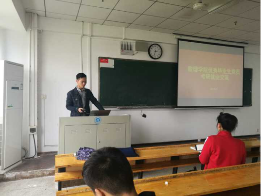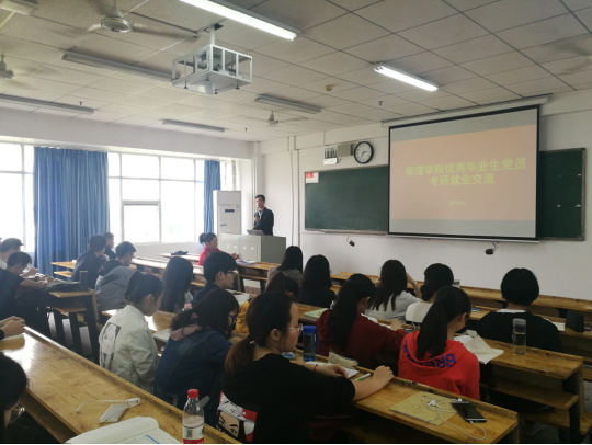 4月18日下午,在第一教学楼410教室,我院优秀毕业生党员程子明以自身经验和对本专业就业情况的丰富了解同16级学弟学妹上做就业考研交流。