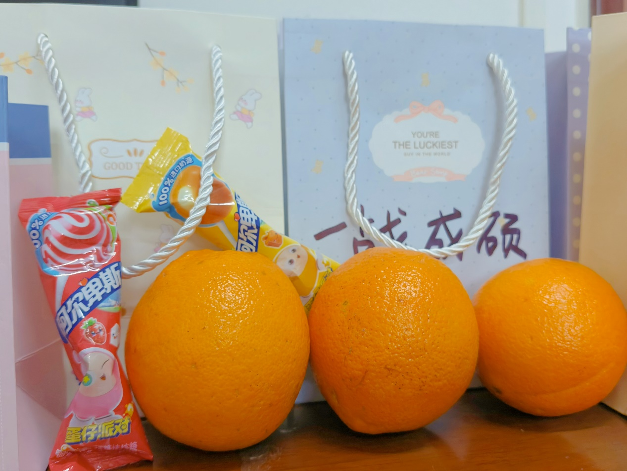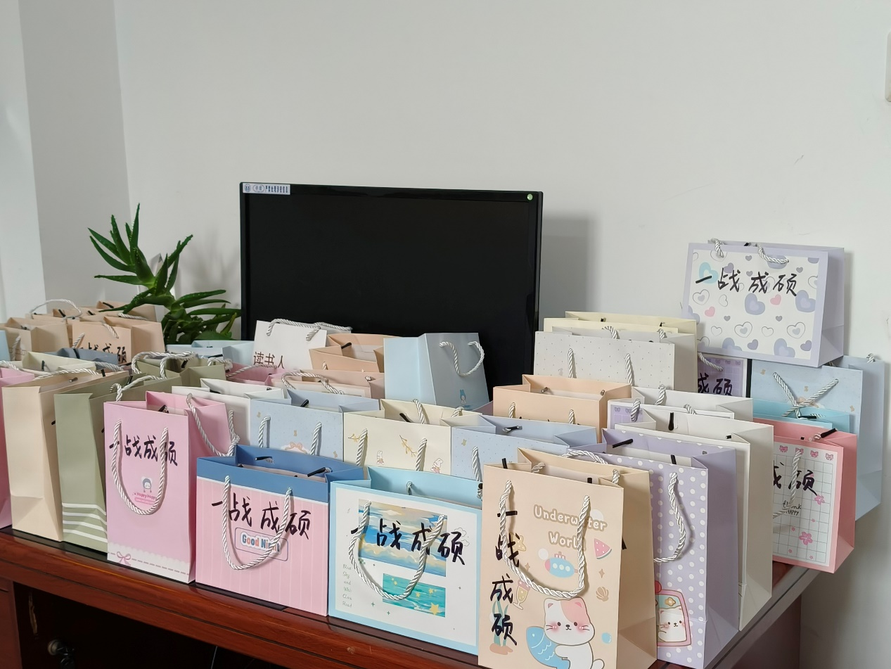 考研加油包的礼袋上清晰地写着“一战成硕”,这四个字简洁有力,表达了学院对考研学子最美好的祝愿。同时,大礼包中装有寓意美好的橙子和棒棒糖。橙子取其谐音“成”,寓意着考研学子能够在考试中取得成功;棒棒糖则象征着甜蜜,希望学子们在考研这条艰辛的道路上能收获甜蜜的结果。