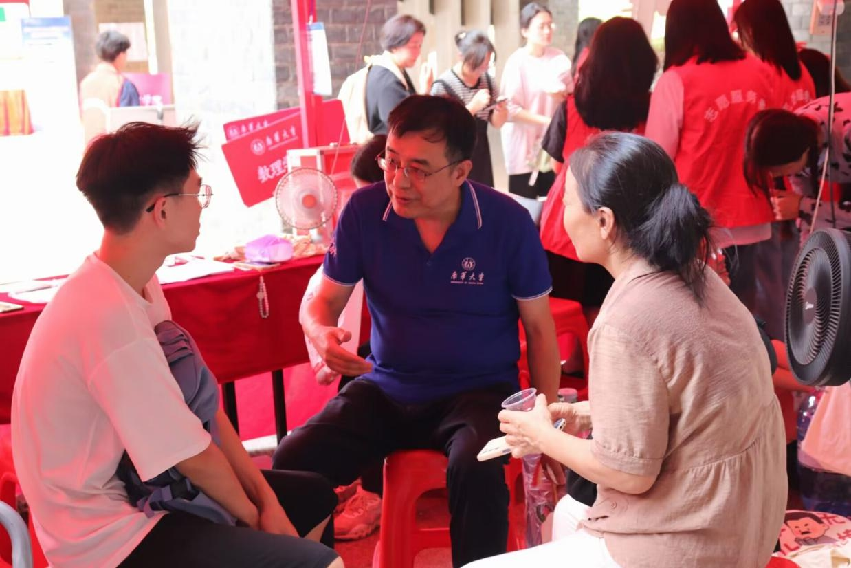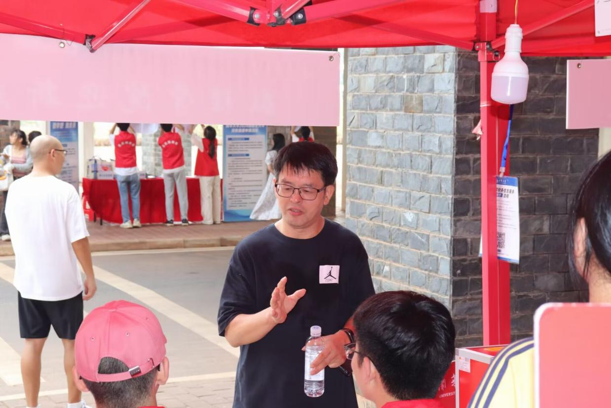迎新工作期间,数理学院党委书记谭建国,院长林文斌,党委副书记田生军也来到了迎新现场,了解报到进展,细致地指导着迎新工作,同时十分关心志愿者们在高温下的身体状况,温馨提示大家多喝水。