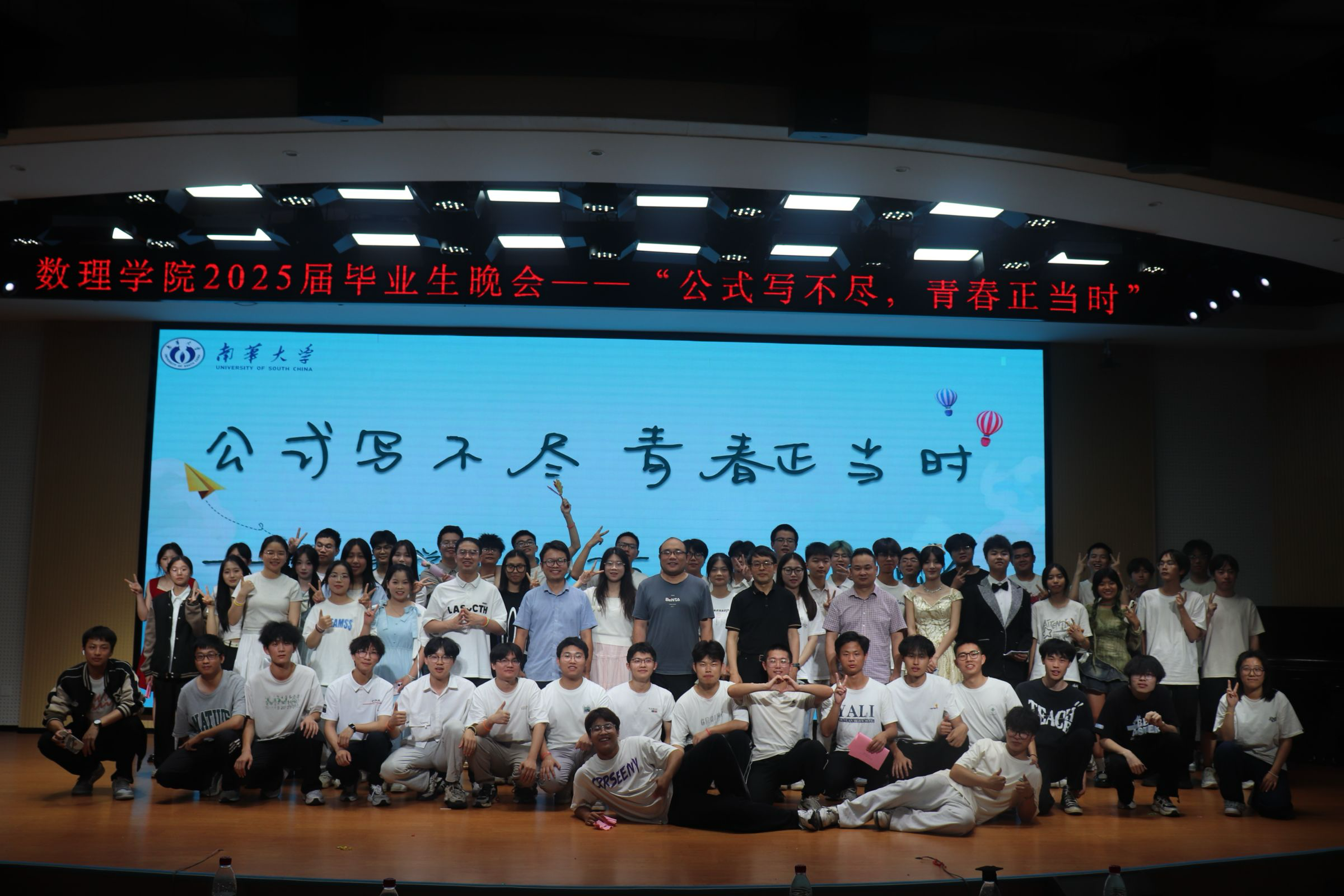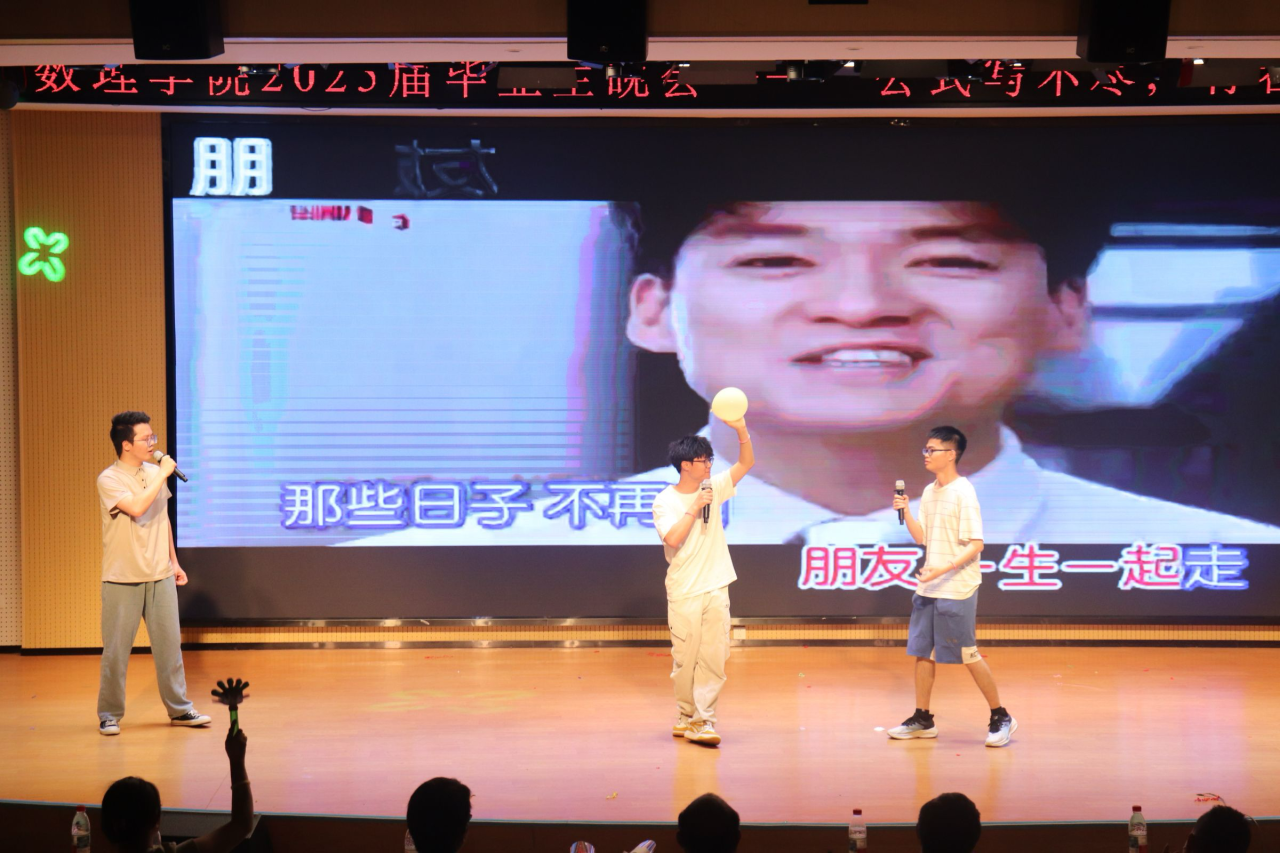 节目环节精彩纷呈。毕业班党员带来的团体舞蹈《我的未来式》活力四射,瞬间点燃现场气氛;朱闹同学独唱的《永不失联的爱》,以温暖歌声传递出爱的力量;黄智祥同学带来的《那个远方》,用动人旋律唤起大家对梦想的执着追求。舞蹈串烧、歌曲串烧等节目形式多样,表演者们用精湛技艺和饱满热情,展现了青春风采。数理学院文艺部的合唱、邬佳晋与程春乐同学的《那些年》、江鹏飞同学的《知我》等演唱,或激昂或深情,带领大家重温大学美好时光。数理学院团学会的团体舞蹈《GGBOND》、黄雨欣同学的舞蹈串烧,以灵动舞姿为晚会增添绚丽色彩。李⼩琛、冼茂均、周东亮同学合唱的《朋友》,唱出了同窗间深厚情谊;好好学习读书会的诗歌朗诵《礼赞·青春》,用优美诗句礼赞青春,引发全场共鸣。