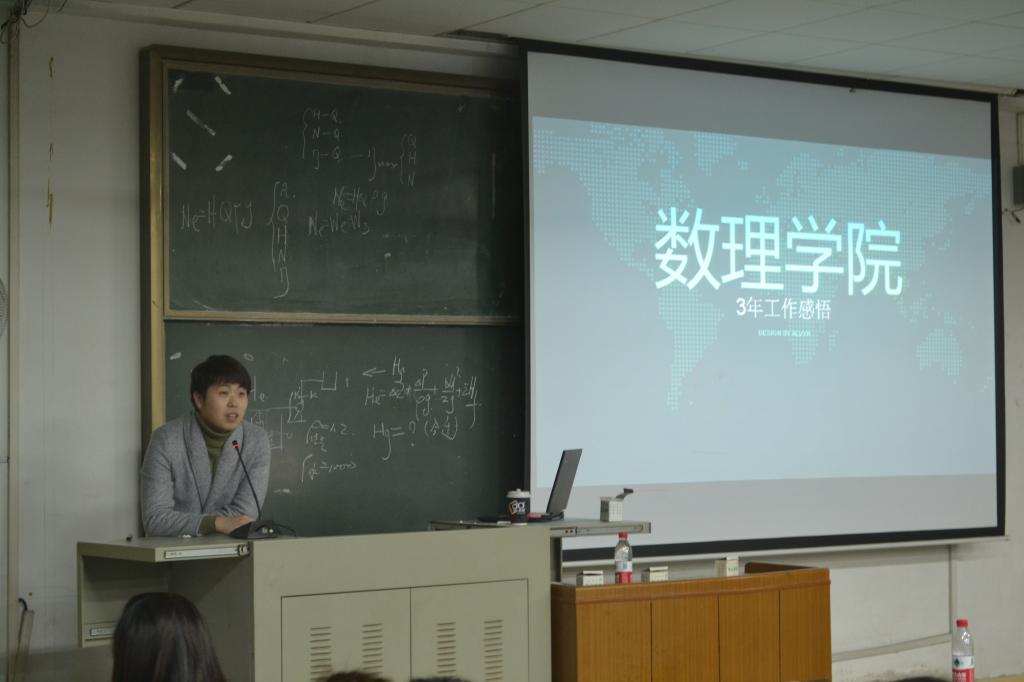 紧接着,我院优秀校友许圣斌上台演讲。许圣斌在大学时期曾担任数理学院宣传部部长,他才艺出众,组织能力极强。2011、2012年由他带领的大一新生参加新生才艺大赛,分别获得优胜奖和二等奖的好成绩。他为我校画的圣诞晚会背景墙,至今任留在北校活动中心。他以“现状--了解自己--梦想--目标--计划”为主线,结合自身经历进行了精彩演讲。他首先分析了当下毕业生求职状况,指出IT行业是一个薪资高,人才需求量大,且竞争激烈的行业,而我院信息与计算科学专业非常符合未来大数据时代的行业发展需要。他强调学好数学的重要性,“一个IT工作者可以在行业里走得多远,这取决于他的数学功底。”并用我院“宇宙真奥,源自数理”的理念进行了诠释。他告诉大家要多多了解自己,适合自己的才是最好的。之后他指出,大家一定要树立自己的梦想,有梦想才能在枯燥乏味的学习中找到源源不断的动力。并结合自身经历,告诉大家要制定合适的目标,重视与人交流,他绘声绘色地谈起自己的同事,因每次都只说一个“嗯”并带一个莫名其妙的微笑令人哭笑不得,幽默的语言和搞笑的表情逗得全场哄堂大笑,现场气氛活跃,掌声不断。