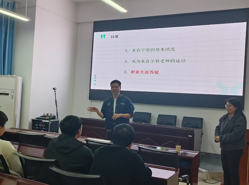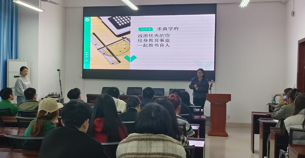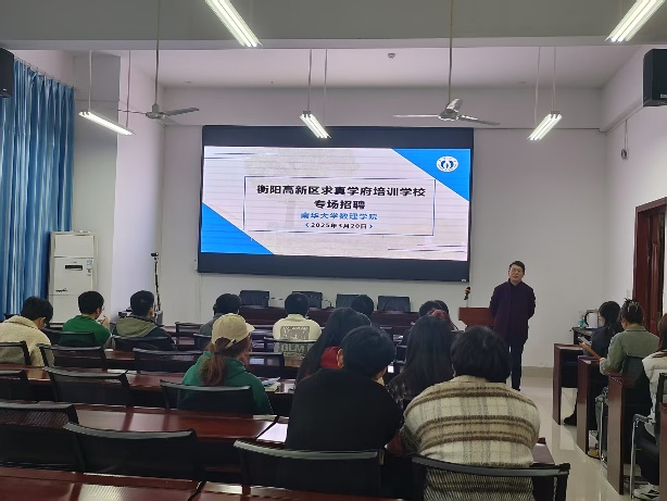 2025年3月20日下午3点,衡阳高新区求真学府培训学校专场招聘会在崇德楼108顺利召开。数理学院党委副书记田生军、团委书记吴庆林以及21级全体在校学生到场参加。本次招聘会现场气氛热烈,同学们认真了解了学校的招聘信息和发展机会。